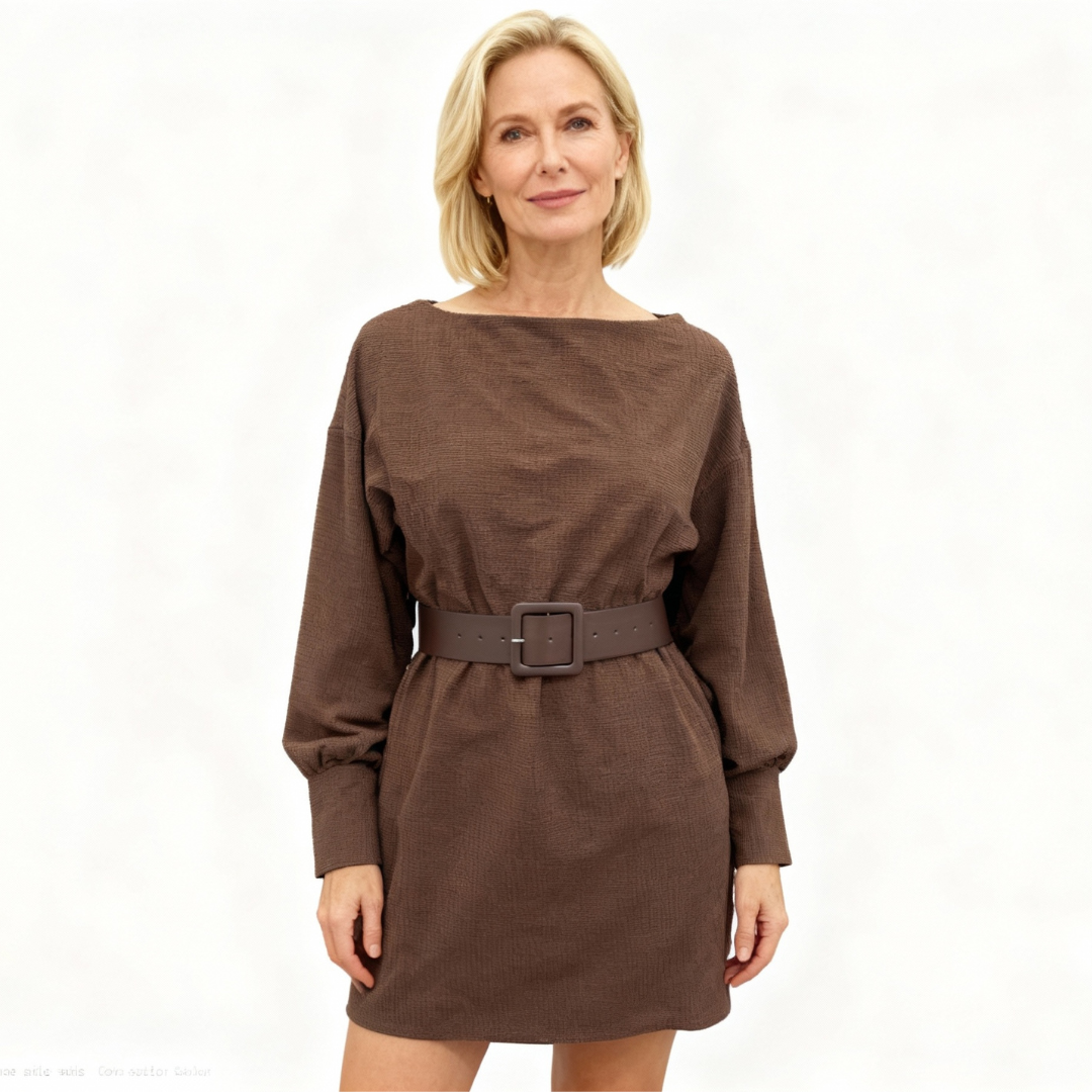 Effortless style meets refined comfort in this chic dress designed to flatter your silhouette. The belted waist adds a touch of sophistication, while the soft texture and modern cut make it perfect for both casual and elegant occasions. A wardrobe essential that blends confidence and grace seamlessly.